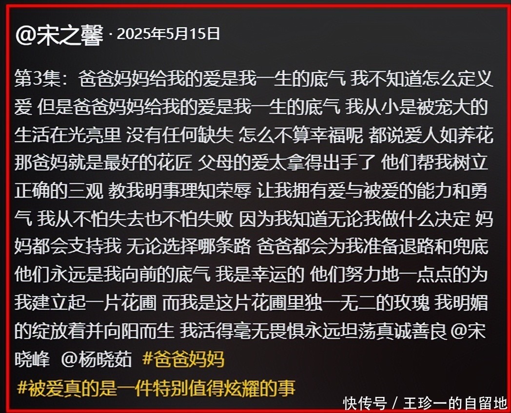 作为父亲,得知爆料内容,相信宋晓峰也会好好教育引导孩子,避免孩子犯下更大的错误。从这2年,宋之馨发布的动态看,她似乎已经懂得了感恩,知道了父母的不易。