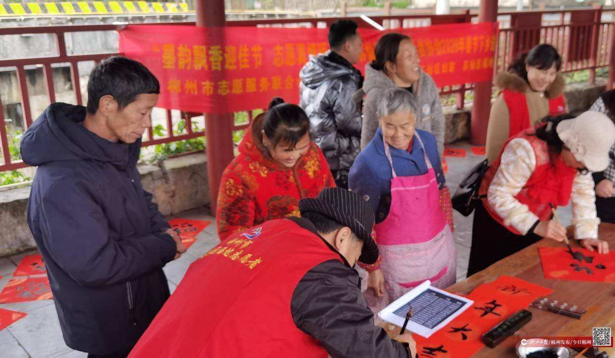 为了让行动不便的老人、留守儿童也能感受到节日的温暖,苏仙区福地志愿者协会会长李艳兰带领志愿者们组成“送福小分队”,带着写好的春联和福字挨家挨户上门赠送。每到一处,志愿者们都与老人、留守儿童亲切交谈,详细询问他们的生活情况,为他们送上新春的祝福和问候。据统计,此次活动中志愿者们共为村民书写赠送春联100余副、福字200余个。