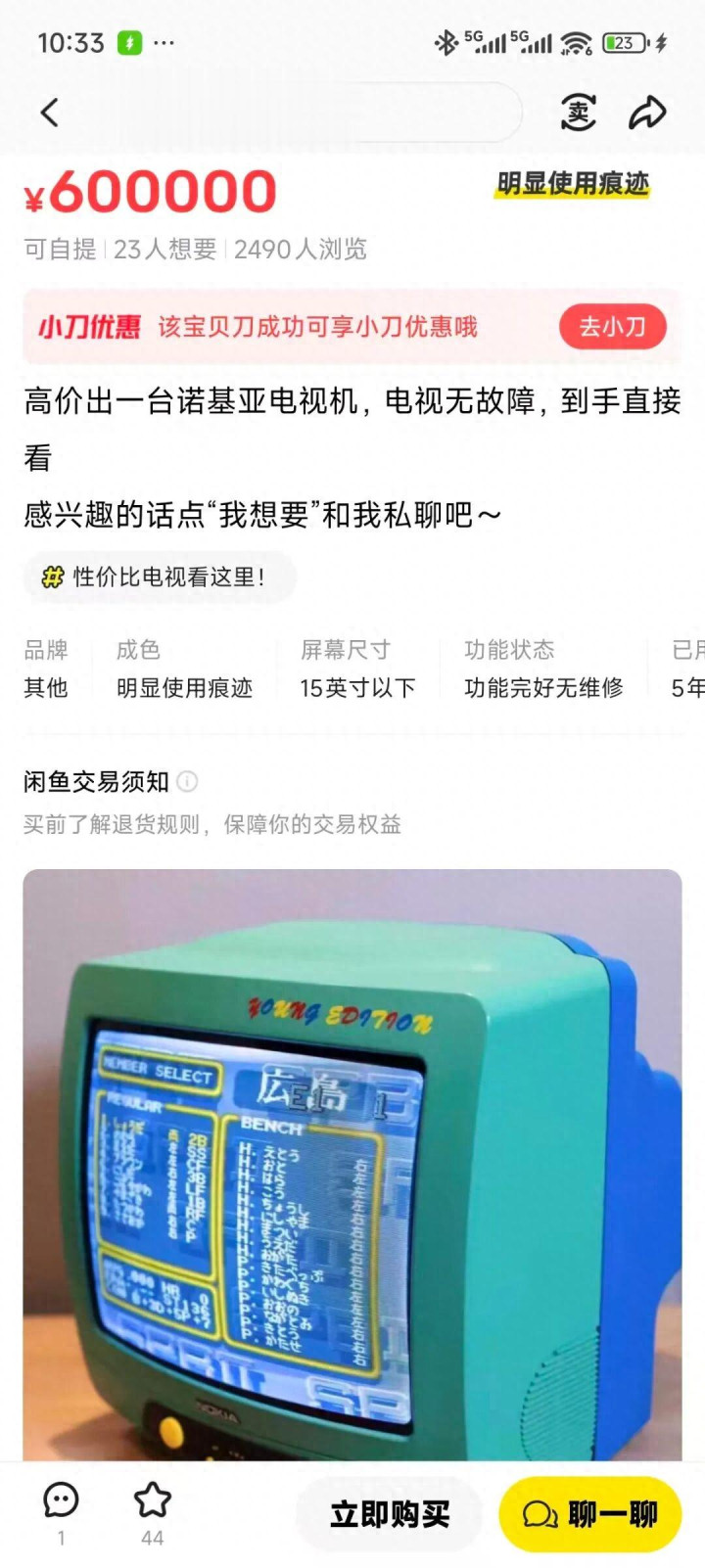 没错,目前全网独一份的这台诺基亚电视,闲鱼开价60万,这就跟炒古董似的,独一无二才值钱,价格随便标。如果这是第二位买家花6K买的电视,那么“炒作价值”翻了十倍,但漫天要价,就地还钱,屠龙刀自然少不了。