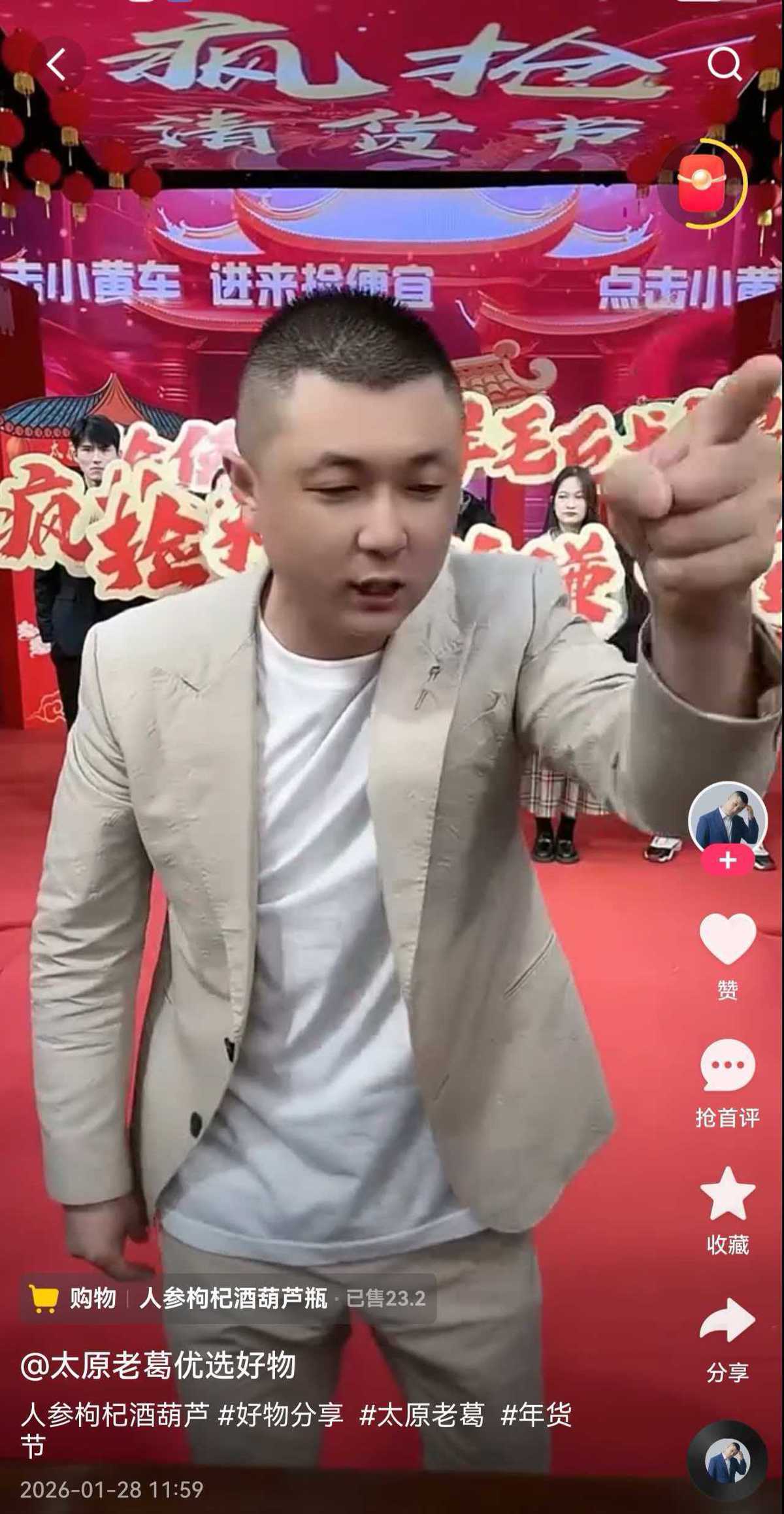28日上午,极目新闻记者注意到,“太原老葛”主号粉丝高达9900.3万,头像为本人侧面肖像配以“太原老葛”四个字,账号名称为“老葛29号超级年货盛宴”。