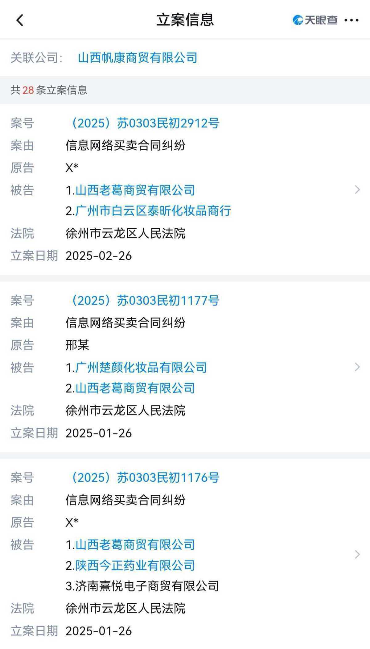 天眼查风险提示,该公司2024至2025年共有28条立案信息,被告案由基本上都是“信息网络买卖合同纠纷”,涉及全国多地。