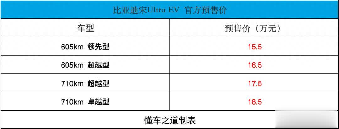 3月5日,比亚迪宋Ultra EV开启预售,新车共推出4款车型,预售价15.5-18.5万元。新车采用全新设计,提供第二代刀片电池、闪充技术及可选装激光雷达,新车将于3月底正式上市。下面,和大家一起来看看新车的产品力如何?